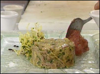 【它是真的】頓悟二:英國 Worcester 的 Hadley Bowling Green Inn 還推出過下圖這等 creative gourmet,也就是創意料理;不過被動物保育人士抗議就從菜單拿掉了。湯匙部份讓我想到在蘇黎士吃到的 beef steak in Tartar style(這夢靨,請容我來日專文哭訴)!